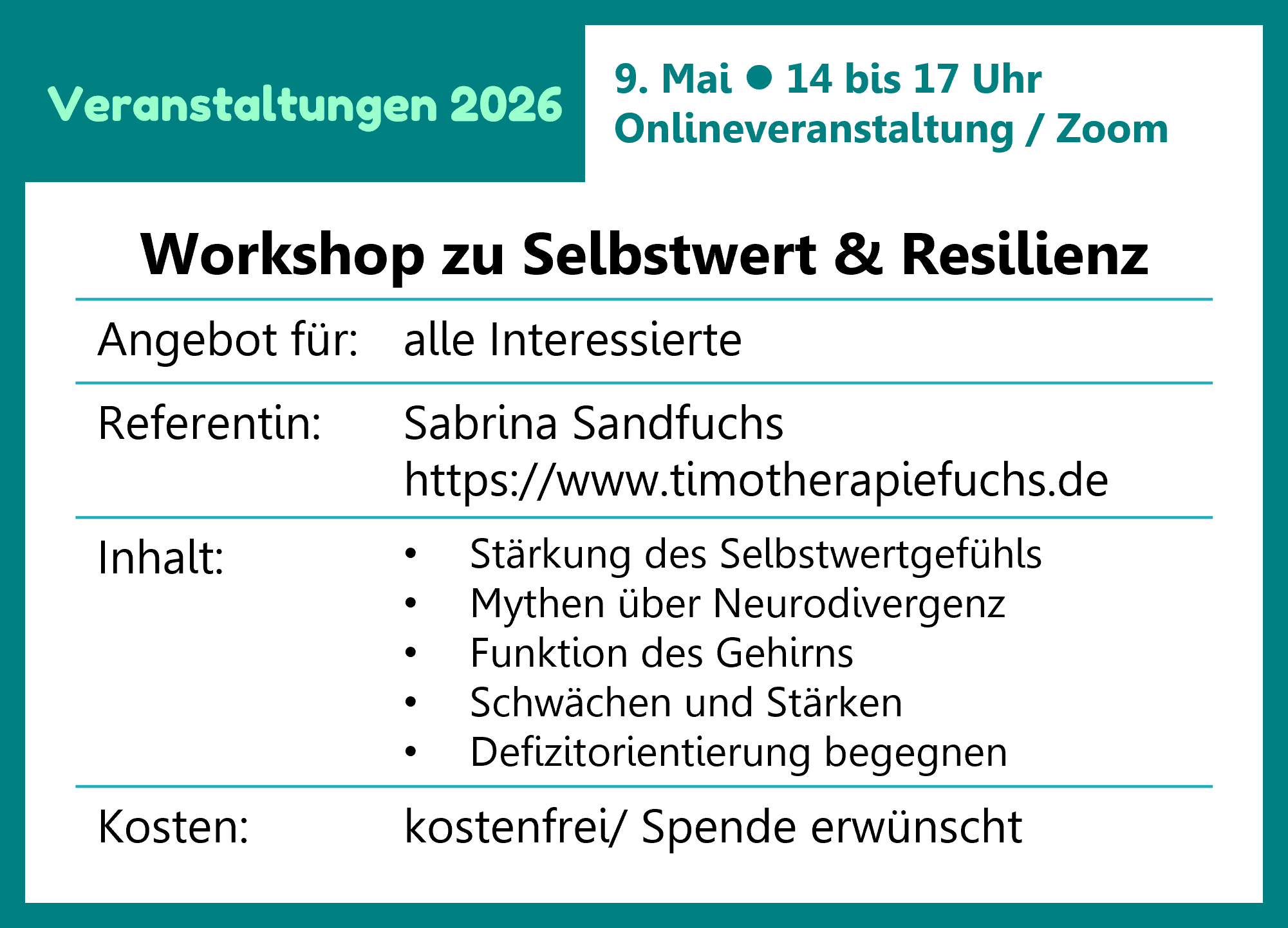 - Inhalte: Selbstwertgefühl, Resilienz, Aufräumen mit Mythen über Neurodivergenz, wie funktioniert das Gehirn, Schwächen/ Stärken, weg vom defizitorientiertem Denken